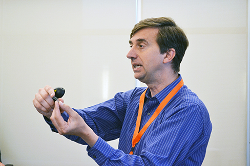 Joe Muskin explains the property of Nitinol to teachers in his session. An alloy of nickel and titanium, Nitinol is a memory metal whose shape can be changed; however, when placed in hot water, it returns to its original shape.