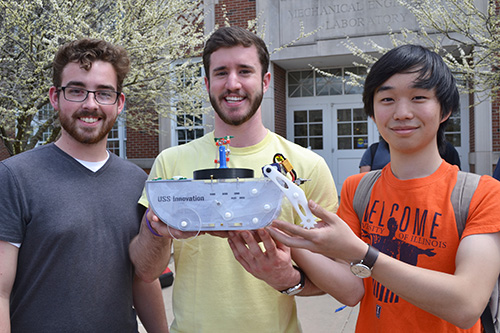 Evidently the U.S.S. Innovation team encountered lots of complications. MechSE sophomore Daniel Bumpus says, “The most challenging part was last night when it just seemed like pretty much everything broke!” They had a crank break, both gears broke, one of the things on the back of the motor broke. “That actually sheared off,” he divulges, “and we had to re-solder it last night at like 2:00 am, but we’re pretty pleased with how it turned out.”