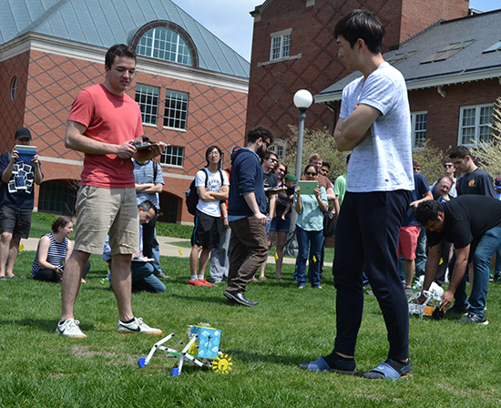 It was noon on Wednesday, May 2nd on Engineering Quad, and the hopes and dreams of a group of Mechanical Science and Engineering (MechSE) students were riding on the little robot they’d built for the ME370 projects course final competition: the March of the Automata. Their motivation? If their team’s automaton won the race, they’d not only have bragging rights, but they’d get a bye on the upcoming final exam.