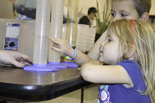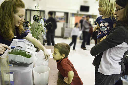 Another Illinois student, Danielle Cooney, a graduate student in Crop Sciences, exposed young STEM Night visitors to a demonstration about erosion. She would pour equal amounts of water into three containers: one was planted with thick grass, one contained a mixture of bark and chips, and was filled with soil only. After water had been poured into the three containers, students were then asked to point out which water was the cleanest (the container with the grass); most could see how a cover crop, like the grass, helped prevent erosion.