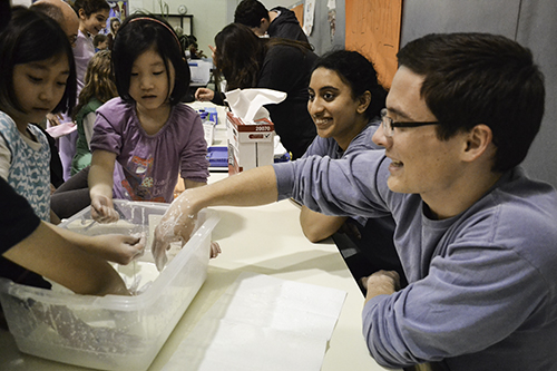 Several students from REACT (Reaching and Educating America's Chemists of Tomorrow) an Illinois student outreach group that does Chemistry demonstrations and hands-on activities. Students were able to get their hands on Oobleck (the non-Newtonian slimy substance that acts like a liquid—unless force is applied; then it acts like a solid.
