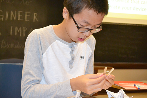 Participants also learned what being a student at Illinois might be like as they interacted with a panel of BioE students and toured two campus buildings: Everitt Lab, the new home of BioE, and IGB, the Institute of Genomic Biology. Plus, they learned a bit more about what Bioengineers can do while being exposed to some of the projects BMES students have created for EOH (Engineering Open House), such as a prosthetic hand, learned about hydrogels (the future of drug delivery?), and made DNA origami.