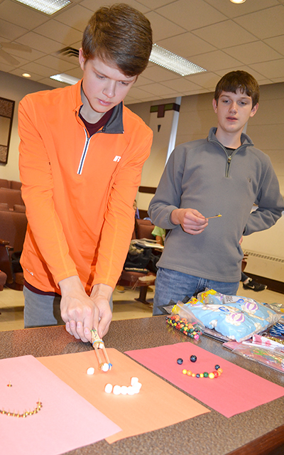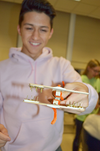 In one of the key events of the day, participants then got to try creating devices themselves during the design activity. Students were challenged to create a device that would pick up a number of different different-shaped objects: beads, marshmallows, tacks, and dice. Their apparatus was to not only pick up the objects individually, but possibly have different adaptions to pick up the various objects. Students were also encouraged to try to pick up several objects at a time, and also using just one hand.