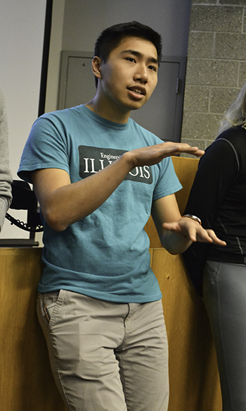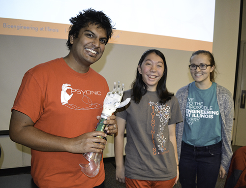 Speakers for the event included Assistant Professor Jenny Amos, who shared about Illinois’ new engineering-based College of Medicine at the intersection of engineering and medicine. MD/Ph.D. student Aadeel Aktar also spoke, sharing about his experiences in prosthetics, including his new startup company, Psyonic, which builds low-cost prosthetics. Aktar's prosthetic hand is ground-breaking, in that sensors allow an amputee to control the prosthetic's movement using the same muscles in his/her arm that controlled their hand; plus, the sensors transmit back to the brain the sensations of what the "fingers" are touching,