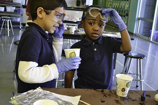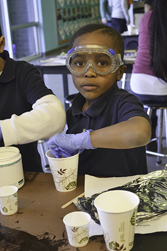 Garbed in rubber gloves and protective goggles, Next Generation School (NGS) eighth graders on a February 23rd field trip to Booker T Washington STEM Academy (BTW), shared with BTW kindergarteners the art of making bouncy balls. According to NGS Science Teacher Bryant Fritz, it was a win-win for both groups of students. His eighth graders experienced working with young children and how to take the principles they have learned down to a level younger students can understand. BTW youngsters were exposed to some lab principles, learned how to use scientific equipment, and, of course, ended up with a ball that they had made all by themselves (with a bit of help from their older mentors.) And they all had fun.
