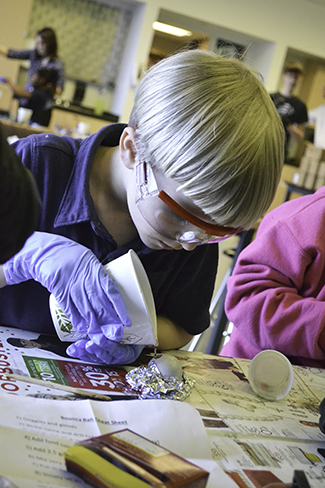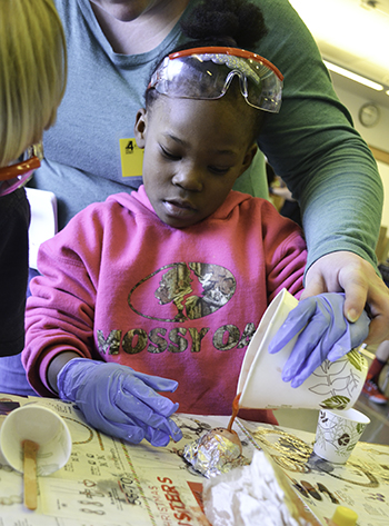 Above: An NGS student helps a kindergartener with her polymer mixture.