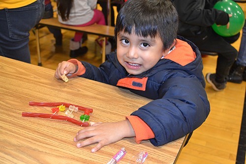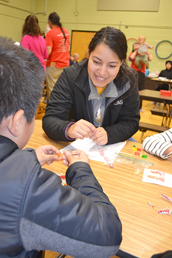 A group of around 80+ mostly Hispanic K–5 students and their families showed up for the November 5th Cena y Ciencias (Spanish for “Supper and Science”) at Dr. Preston Williams Elementary School in Urbana. Supported through University partners that include the Illinois Materials Research Science and Engineering Center (I-MRSEC) and the Illinois chapter of the Society of the Advancement of Chicanos and Native American Scientists (SACNAS); the National Science Foundation, which has been a source of support for the program since its inception; Urbana School District employees; as well as parents, the program is addressing materials such as polímeros (Spanish for polymers)—the star of the November outreach. And while the free pizza most likely provided some incentive for families to take part, based on the youngsters’ excitement, it was apparent that participating in different hands-on science activities led completely in Spanish was their main focus during the evening.