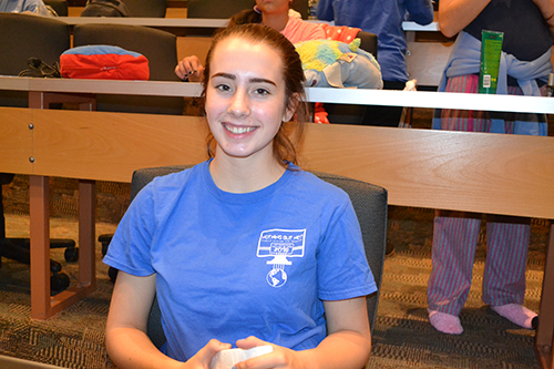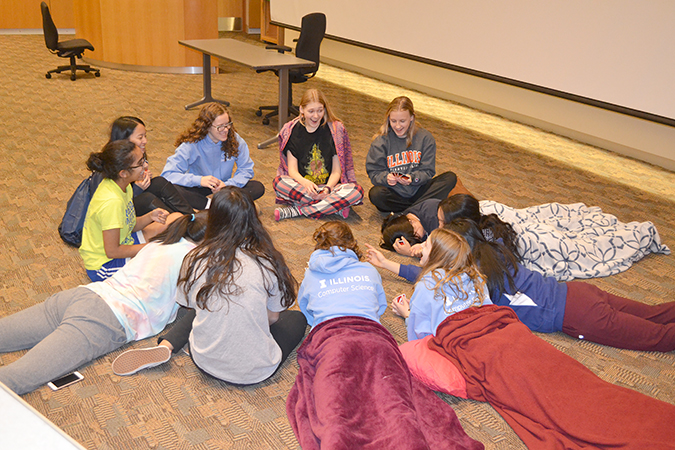 ChicTech planners sought to convey to the participants that Illinois CS students don’t just code 24/7, but that they also know how to have fun. So after a day spent hunkered down over computers and wrestling with coding challenges, the girls got into some comfy clothes and settled in for Girls’ Night—a relaxing evening playing games, making relationships, and just plain having fun doing...girl-type things. So, with the Disney movie Mulan in the background on the big screen, the girls, both young and old, bonded while doing their nails or playing games, such as a rousing game of Uno while many of the participants were ensconced in their "blankies" or sleeping bags.