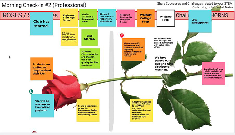 The agenda for the day included a mix of lectures/videos; participant sharing via Zoom text comments, posting reflections on the Jamboard, and face-to-face discussion both to the entire group and in breakout rooms; and hands-on activities. For instance, during an Engineering Design session led by Amari Simpson, he guided a discussion about a shared article using a text-rendering protocol where educators manipulated information from the text based on what stood out to them individually. They wrapped up the session with individuals sharing their takeaways and discussing other resources for STEM clubs.