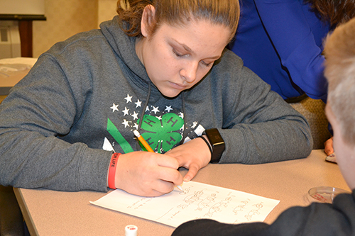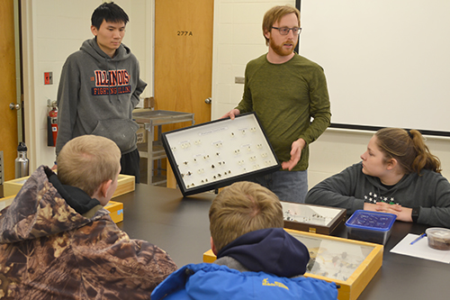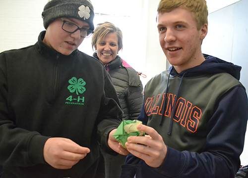 On March 4th, ten junior high and high school students, members of Clinton County’s 4-H Federation leadership group, traveled up from southern Illinois to spend the day on the Illinois campus. During their visit, they participated in STEM hands-on activities and briefly toured a number of campus buildings, including the IGB. While here, they were exposed to several STEM disciplines, dabbling a bit in Mechanical Engineering, Math, Aerospace Engineering, Molecular and Cellular Biology, and Entomology. Plus, they got to interact with a number of Illinois students to find out what being a student at Illinois might be like, as well as some possible career options.