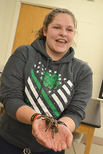 The group’s final activity of the day was a trip to Morrill Hall to interact with Ed Hsieh and Scott Clem, the two Outreach Coordinators of the Entomology Graduate Student Association (EGSA). In addition to viewing the EGSA’s insect collection and learning a lot about various insects, the more intrepid students (and leaders), were able to touch or hold different insects from Entomology’s Petting Zoo, including Cecelia, the Tarantula.