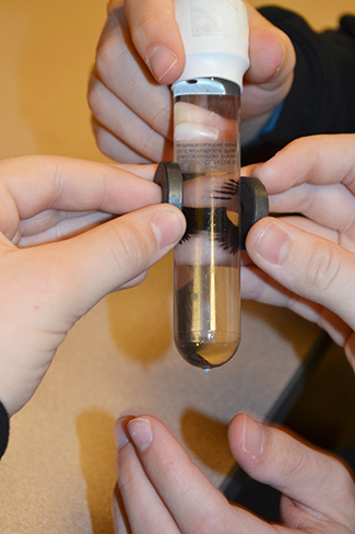 In another activity, Muskin illustrated to the students some principles that might explain how a toy works that they probably used to play with when they were kids—a Magnadoodle or an Etch-A-Sketch. The students were given test tubes filled with water and iron ferrite shavings plus magnets, which they used to move the shavings around to create various designs.