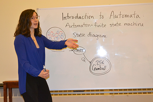Next, several members of the IGL (Illinois Geometry Lab) led the students in some fun activities about mathematics regarding Automata, or finite state machines. An automaton performs a function according to a range of predetermined programmed responses to different circumstances. To introduce the students to the mathematical idea, Alexi Block Gorman drew a state diagram of a gumball machine, to have them help figure out a number of scenarios where if the gumball costs 25¢, what are the various combinations of coins that one can use to purchase it (such as a dime, a dime, and a nickel). Her second example was using binary code (a string of 0s and 1s) to print something on a printer that will not print when a 0 is sent but will only print when it receives a 1. Students were then given some worksheets to complete related to those principles.