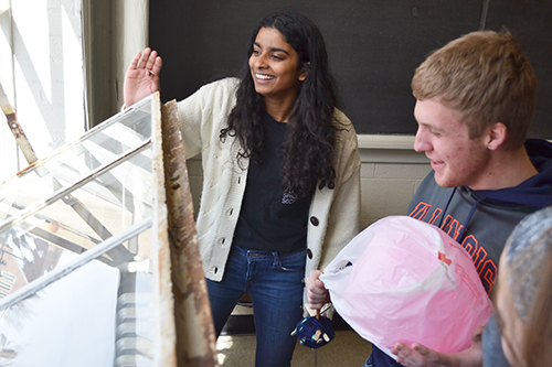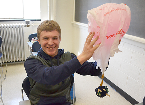 Following the tour, the group broke into teams to complete a fun aerospace-related hands-on activity, an Egg Drop competition. The idea was to use a number of materials, such as balloons, plastic grocery bags, cotton balls, etc., to build a contrivance similar to a parachute that would protect an egg during a fall…from a second story window in Talbot. Students came up with a variety of designs and learned some things about not just engineering but teamwork during the process. A few teams even successfully protected their eggs!