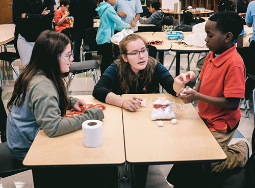 The school visits that so significantly impacted Kochanski’s career choices are one of EA’s main activities. Co-founder and co-advisor, Bioengineering Associate Professor Jenny Amos, calls outreach activities in K–12 schools the group’s “bread and butter.” They usually visit around three different schools a week, depending on what time slots EA students, who juggle outreach with classes and tests, can accommodate. Also, EA does outreach to not just local but regional schools, such as Chicago Public Schools, both hosting big events in Chicago for the community there and hosting CPS events here on campus.