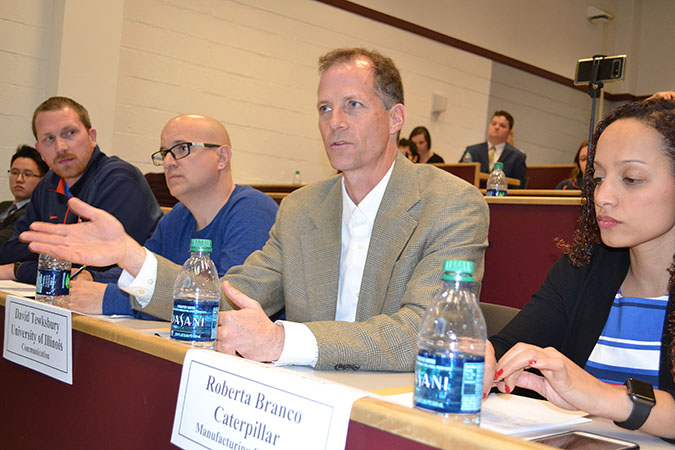 A panel of five prestigious judges, Illinois alumni, engineers in industry, and current faculty, evaluated the finalists using a rubric, which the contestants had in advance. The panel was comprised of: Roberta Branco, a manufacturing engineer who works at Caterpillar in Decatur, Illinois; MechSE Professor Bruce Flaschpart, who is also the Director of the Engineering Student Projects Lab; Jack Ingram, an ECE alumnus who is a technical manager working on hybrid automobiles at Delphi; Eddie Sun, a recent Illinois grad who is a technical assistant at Lincoln Laboratory in Massachusetts; and David Tewksbury, a Communication Professor and Associate Dean of LAS.