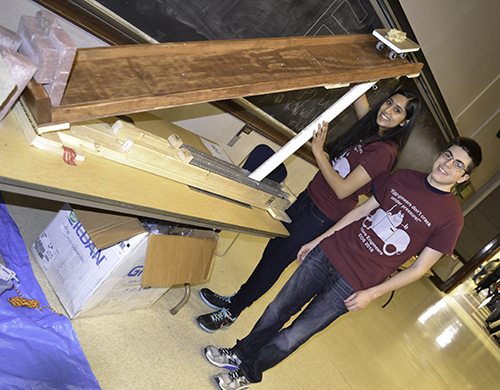 Engineering student Kavita Desai, the outreach chair of EOS, was the one who organized the whole thing. She came up with the project, designed the ramp over winter break, got all the materials together, then she and her cohorts went to the schools to supervise while the kids made the protective devices.