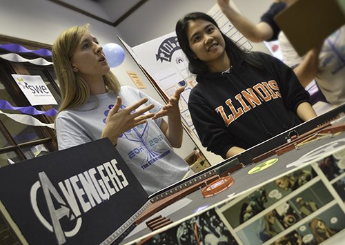 Thousands of guests of all ages flocked to campus on March 11–12, 2016, to attend “The STEM of Innovation,” the College of Engineering’s 96th annual Engineering Open House (EOH). Among them were students from local schools on field trips, including some who showed up as guests of campus student groups, like WIE (Women in Engineering) and EOS (Engineering Outreach Society). Illinois engineering students had done projects with them earlier in the semester then brought them to EOH as a culminating event. Even some former students showed up representing their current companies, like Ford, to try to lure youngsters into engineering…or to entice current engineering students into their company. And of course, lots of Illinois engineering students showed up to strut their stuff.