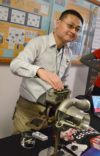 A Cummins representative shows off one of the motors they build.Also, since the University donates a lot of money to help fund the teams, they also feel obliged to show the powers that be that they’re getting their money’s worth. “We want to give back and kind of showcase what we’ve been doing and how we’ve been spending their money so they know that we’re making really productive use out of the thousands of dollars that they’re donating to us.”