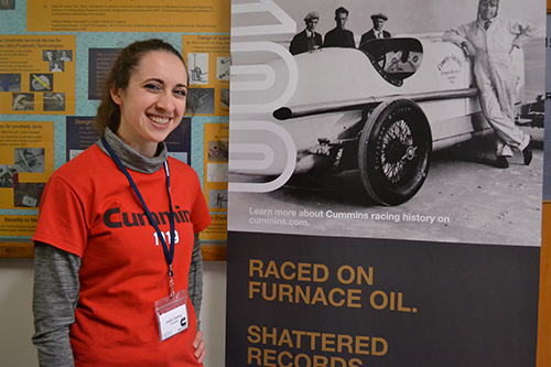 Katelyn Balling at the Cummins booth at EOH 19.An Illinois alumna, Katelyn Balling, who studied aerospace engineering at Illinois from 2010-2014 was at EOH to represent her company, Cummins, which makes all different kinds of engines—except for rocket or airplane engines, which is what she specialized in. She explains how she ended up going to work for a non-aerospace company.