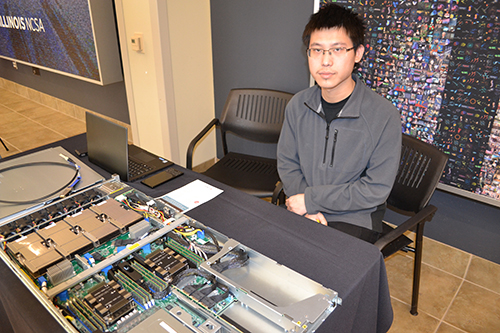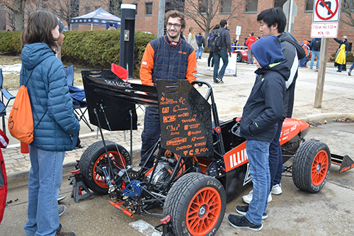 Nick Tuzzak (center) showing the Illini Motor Sports race car to EOH visitors.For example, Illini Motor Sports teams showed off their race cars and hoped to possibly pique some students’ interest in not just engineering, but in their organization. One member of the Formula Electric team was Nick Tuczak, a senior in computer engineering. What was a computer engineering student doing on a racing car team? Shouldn’t it be comprised of mechanical or electrical engineering students. Tuczak explains: