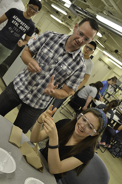 ChBE professor Simon Rogers interacts with high schoolers during his session on catalysis.