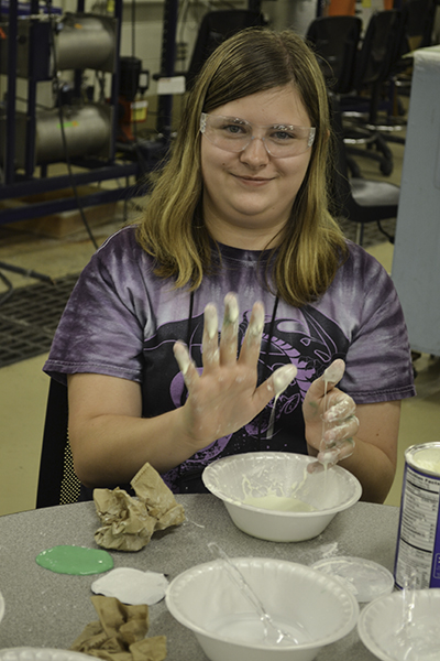 A camper plays with silly putty she made during a hands-on activity.Director of the Chemical Engineering GAMES camp, Diwakar Shukla, and a team of students from his lab led a number of activities, such as making foaming face wash on Sunday night. The campers also participated in a number of hands-on activities where they learned about and got a chance to do procedures using some of the lab equipment: they learned about pumps; DNA extraction, during which the girls extracted DNA from strawberries; the polymer extruder; enzymatic cleaning; continuous distillation; and acid rain. Students also took field trips, such as to the Abbott Power Plant and to the Urbana waste water treatment facility.