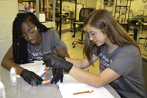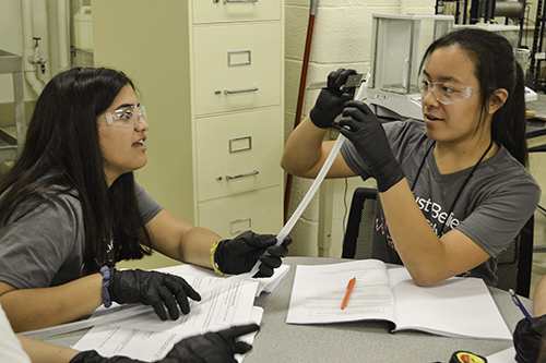 Two students participate in an enzymatic cleaning activity.“Since I came to Illinois” he acknowledges, “I have always tried to take at least one female student in my group every year, as a graduate student, which is very difficult for a computational group. So at this point, my lab has five female students doing computer science and biology and chemical engineering.”