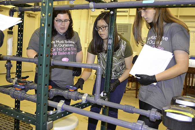 During the Pumps activity, a ChBE student (center) explains to campers how some of the lab's pumping equipment works.