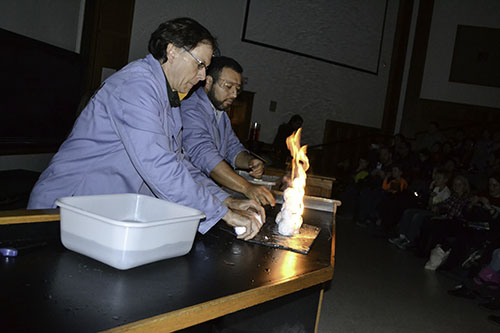 From the very beginning, the Holiday Magic performers exposed the appreciative audience to the magic of chemistry. Like a well-oiled machine, the chemistry crew executed one stunt after another, all exhibiting the show’s trademark formula combining high-energy chemistry (emblazoned across the back of their lab coats, lest we forget), slapstick comedy, magic show, and chemistry lesson, all segued together by banter relating each demo to the holiday theme and accompanied by the appropriate holiday music in the background.
