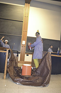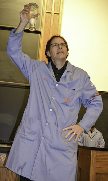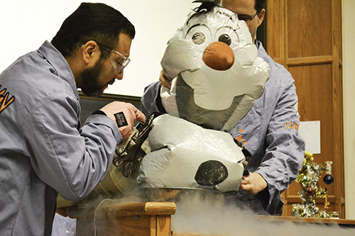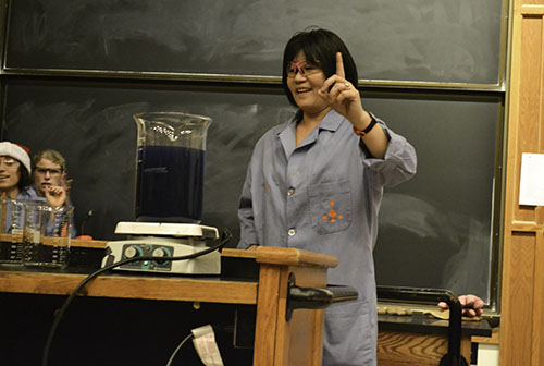 Also heavily were involved were a number of undergrads, who, while behind the scenes, were integral to keeping the show rolling, as each demo required prep beforehand, then both setup and mopup during the show. Multiply that by the show’s three performances (December 7, 10, and 11, 2016), and participating in the Holiday Magic Show is definitely a time commitment. So why do the performers do the show year after year?