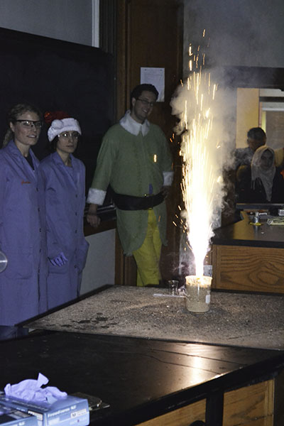 The standing-room-only crowd crammed into 100 Noyes Lab for the final Holiday Magic Show of the season discovered that even chemistry can be magical around the holidays. And after experiencing some demonstrations by several of Chemistry's top instructors, they learned that Chemistry can not only be merry, but bright…and quite loud!