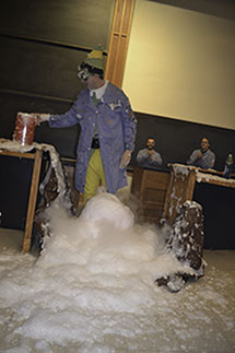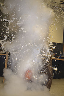 For instance, they began the show with a rousing chorus of “We Wish You a Merry Christmas,” for which the singers’ voices had either a “Three Chipmunks-esque” timbre (due to inhaling gas from Helium-filled balloons), or a “Darth-Vadar-esque” quality (achieved by imbibing from Sulfur-Hexafluoride-filled balloons). The grand finale was a huge, fountain-like explosion of soap suds (due in part to the liberal addition of dish soap by Don DeCoste, Chemistry's Education Specialist, despite being "cautioned" not to do so on several occassions), which liberally doused the Director of General Chemistry, Christian Ray, with suds, and even reached some folks in the first couple of rows in what Ray had warned was the "splash zone."