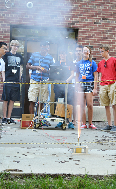 One of the camp's many engaging activities, a rocket propulsion lab, was reminiscent of a real rocket launch at Cape Canaveral. Aerospace Engineering Ph.D. student Marianne Monastero first taught the students some theory behind rocket propulsion, then she and her class adjourned to the Quad for the hands-on portion. Complete with a countdown, the activity had plenty of noise, smoke, and fire, as students ignited four different model rocket engines of various capacities to measure their thrust output and compare their performance. The activity allowed the students to calculate the theoretical height that they could expect their model rockets to reach from the measured thrust-time curve of one of the engines.