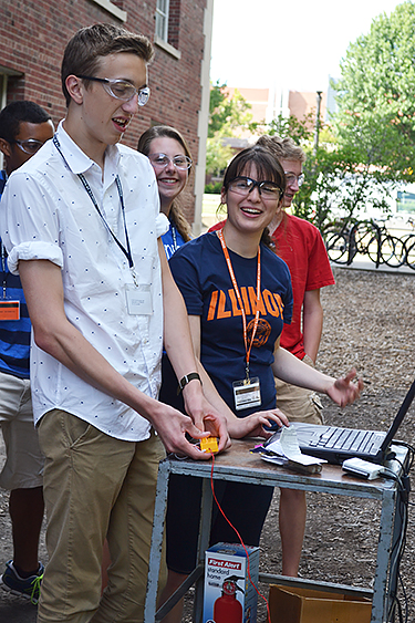 The 40 rising high school students (and one eighth grader), who hailed from near and far, heard about the camp in a variety of ways. For example, Sarah Perdekamp (left), who will be entering the eighth grade next fall and lives nearby in Champaign, Illinois, says her mother told her about IAI; another camper, rising sophomore Noa Seward, from Madison, Wisconsin, says she discovered the camp via Google. How did rising freshman Adam Humphrey, all the way over in Corvallis, Oregon, find out about the camp? In a book offering "300+ tips to get into any college you want," he says. After researching the five camps mentioned in the book's Aerospace section, he selected this one.