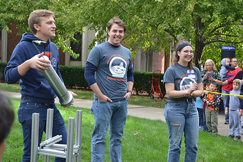 Illinos Aerospace Engineering students explain to young visitors about the parts of a rocket.