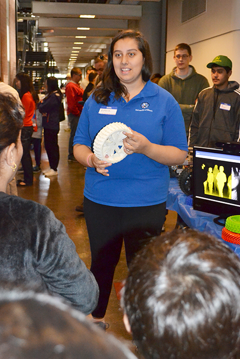 Victoria Jiron, president of Illinois Robotics in Space, shows visitors a part 3D printed for space.