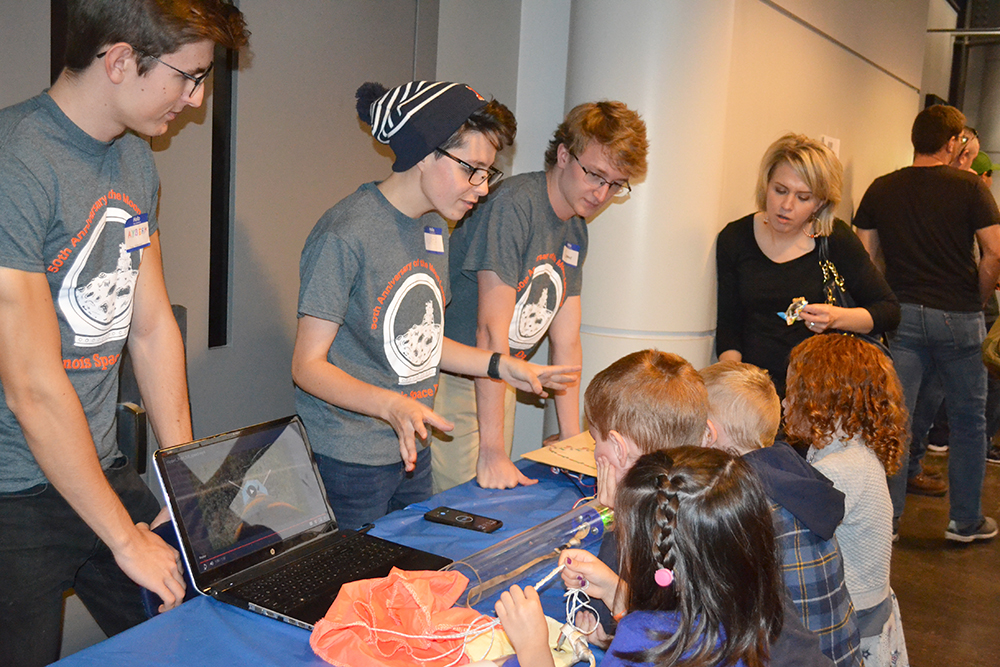 Would you like to blast off on a rocket ship some day to explore outer space? Doubtless some of the around 200 people who showed up for Illinois Space Day (ISD) on October 5th would. Among the 150+ visitors to the event at the Digital Computing Lab were some local teachers, parents, and lots of K–8th grade students—possibly with some future aerospace engineers or maybe even an astronaut or two among them. Also on hand were numerous Illinois Aerospace Engineering students, sporting t-shirts emblazoned with “The 50th anniversary of the Moon Landing!” to celebrate one of Man's most important forrays into space and the theme of the Day: the Apollo 11 mission. The Aerospace students’ goal in participating in the event was to not just share their passion for space with the young visitors, but also to possibly recruit some into aerospace engineering down the road, or to help pique the interest of a future astronaut.