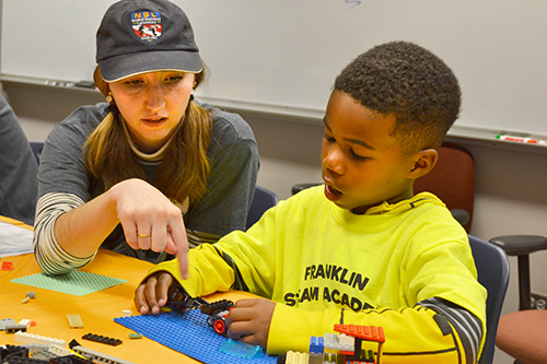 An Illinois Aerospace Engineering student interacts with a young Franklin School student building a space vehicle with Legos.October 18, 2019