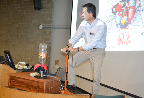 Leon Liebenberg prepares to launch a bottle rocket during his presentation.Following lunch was the guest speaker, Mechanical Science and Engineering Professor Leon Liebenberg. Having had him for courses, the students who planned the event knew how fun and entertaining he was, and thus had invited him to speak. Part of Liebenberg’s strategy to engage the young visitors was to encourage them to help with his presentation. So he’d question them about space and space travel then have them share their responses into a roving microphone. Of course, he wowed the audience by climbing up on top of the desk and using a bicycle pump to launch a bottle rocket.
