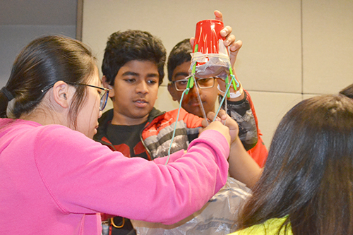 The last event of the day was the egg drop engineering challenge. After building the best egg drop lander they could, the teams of students trooped up to the third floor and, after ensconcing an egg in their contrivance, they dropped it, aiming at the bullseye three stories below, then breathlessly waited to see if their egg had survived intact, or would splatter on the floor below.