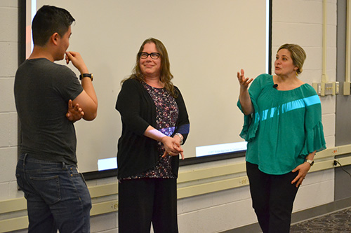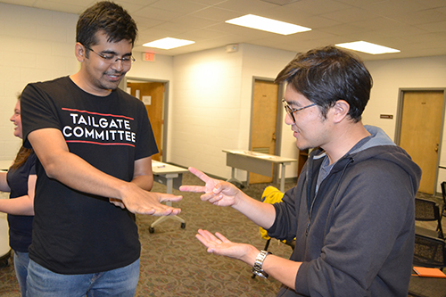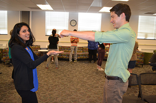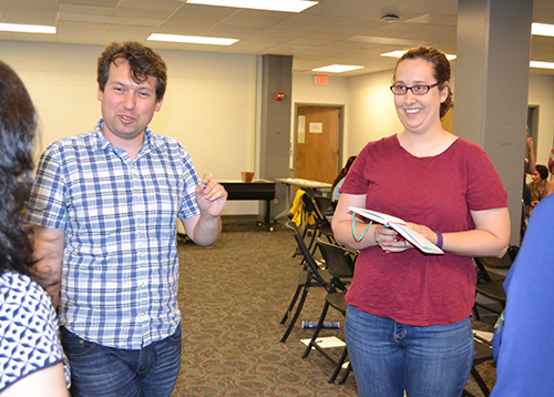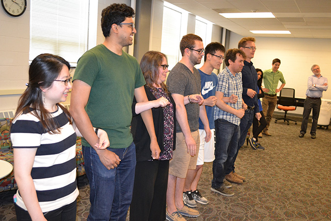 What might fun, team-building exercises such as folding an imaginary bed sheet or carrying an imaginary plate glass window have to do with communicating? How about explaining one’s research to a colleague who’s pretending to be an eleven-year-old? In keeping with one of its chief goals—improving science communication—the Illinois Materials Research Science and Engineering Center (I-MRSEC)) held “Making the Choice to Connect,” an all-day workshop on Friday, May 18th. Presented by Lydia Franco-Hodges from the Alan Alda Center for Communicating Science at Stony Brook University, the workshop sought to improve participants’ communication skills by training them to practice relating to others.