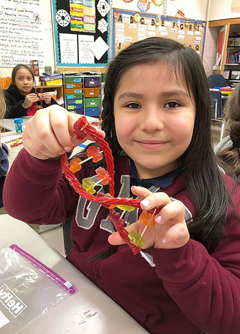 A student exhibits the DNA model that she made during one of the visits to IPA. (Image courtesy of Sharlene Denos.) Denos explains that IPA is very diverse, with only about 10–15% white, non Hispanic, and maybe 15% not white, non Hispanics. Latino students are comprised of those who speak English at home and those who speak Spanish at home. The school shoots for an equal population of kids who speak Spanish at home, who sort of teach their peers Spanish, while the other half of the kids speak English at home and are teaching their peers English. “So everybody's improving their languages together, and they work together to do that. And at the end they are supposed to be bilingual and bicultural.”