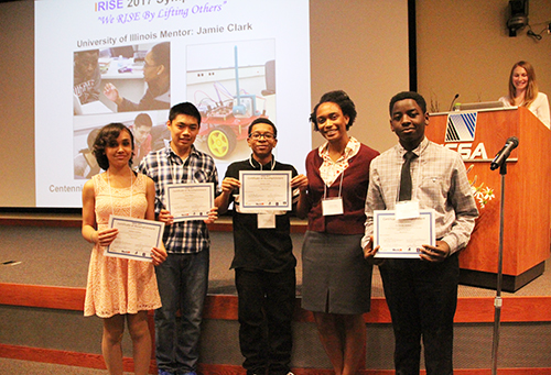 To celebrate the achievements of Centennial’s IRISE Engineering Scholars, the IRISE 2017 Symposium was held at NCSA on May 9th. A lunch reception and the students’ poster presentations were followed by a video highlighting IRISE’s program in 2017, a keynote by Illinois Wheelchair Basketball Coach Matt Buchi, and recognition of Centennial’s IRISE Engineering Scholars.