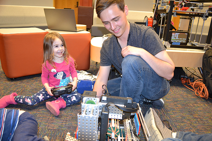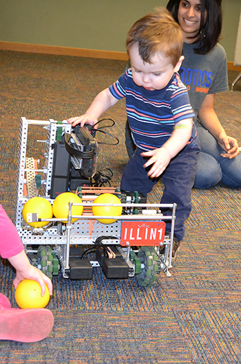 On April 1st, several local youngsters whose parents were participating in the Health Make-A-Thon got an up-close-and-personal introduction to robots courtesy of iRobotics, an Illinois RSO (Registered Student Organization) that seeks to spread its members’ passion for engineering and robotics to youth throughout the community. The children at the event not only watched these robots in action, but they even discovered some of the things the little machines can do firsthand when they got to hold the controllers and operate a couple themselves. The iRobotics students were hopeful that this early exposure to robotics might lead to an interest in STEM or even robotics down the road.