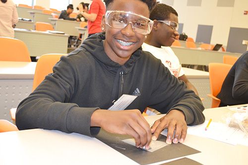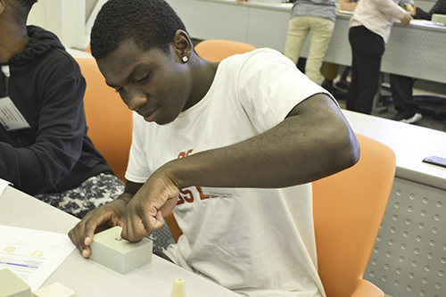 During the CEE Day activities, Akono and her students introduced the high-schoolers to jargon they use every day— concepts like the mechanics and physics of fracture and the connection between a material’s microstructure, composition, and fracture resistance. After each brief teaching, students performed a related hands-on activity. For instance, they did an indentation test to measure the strength of various materials, using metal balls to make indentations in a foam block, a limestone slab, and a piece of composite or plastic, then measuring the indentations in each.
