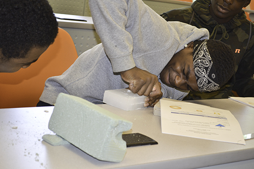 To experience how researchers prepare stones for indentation tests, the high schoolers learned how to polish specimens. Using a four-part polishing process, they polished for two minutes using a very rough piece of sandpaper, repeating the step with progressively finer and finer sand paper, until the stones' surfaces were no longer cloudy and rough but so smooth and polished that an image of the building visible in the windows behind them was reflected on the face stone.