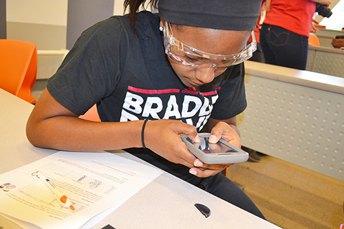 A UHS student uses her cell phone to get an upclose look at the specimen she's been polishing.According to Akono, events like this help high school students “get excited about science. They get to discover an aspect of science they wouldn't have thought about. In this case, we're looking at civil engineering. They get to understand what it is to be a civil engineer, what kind of questions we're asking, and how this is both exciting but also applicable in real life.”