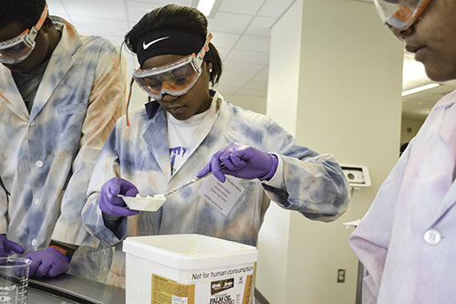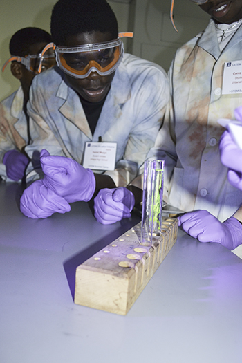 This was one of a number of chemistry-related topics that 27 Urbana High School (UHS) students got to explore and test on Tuesday, August 15, as a part of the brand new I-STEM Summer Camp, a multidisciplinary summer program that ran from August 7–18. The camp was aimed at exposing under-represented minorities to many STEM fields and job opportunities, as well as building teamwork and lab skills.