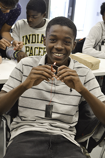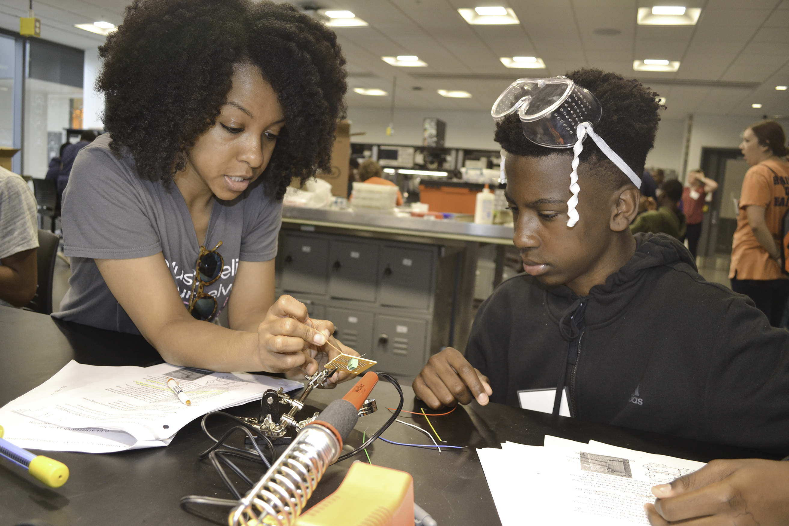Lonna Edwards, an ECE grad student, helps a camper build a circuit“The earlier you get exposed, the better you'll be at it," she adds, "because it won't be as stressful, and because it's something you've seen before. You'll be able to learn it and be confident. So I wanted to reach out to kids who are younger so they get that exposure, especially kids that are under-represented in the field.”